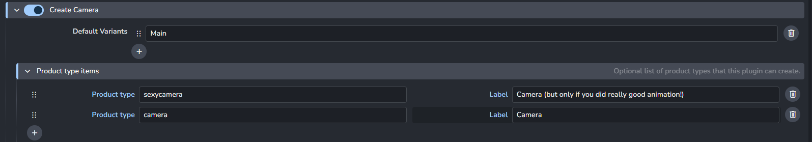 The settings are on the Creators, e.g. ayon+settings://maya/create/CreateCamera/product_type_items