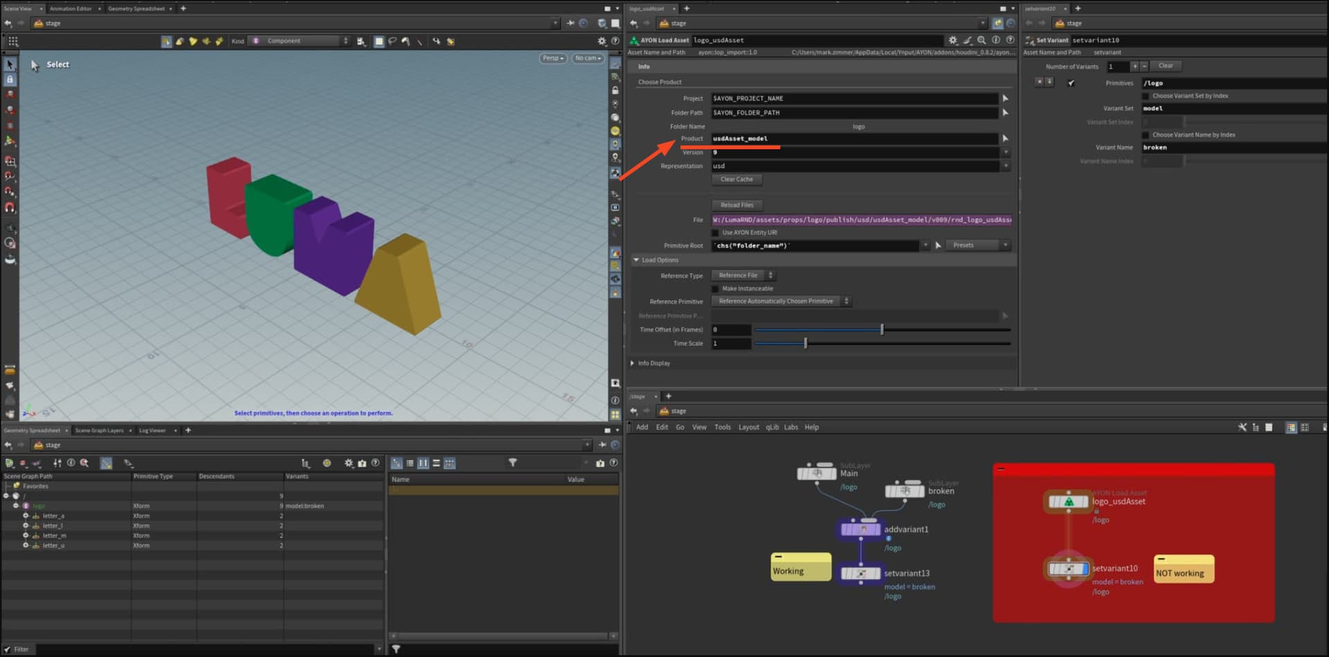 Secondly, I have tested loading the asset product as “usdAsset” and “usdAsset_model” while trying to set the variant via it’s name. The broken variant name is being pulled through BUT the model doesn’t update on both…