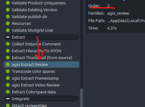 Thanks for the advice. I tried adding a new frameRange at the end of the plugin, but it didn’t help — AYON wrote a different one. For context, here is the plugin execution order.